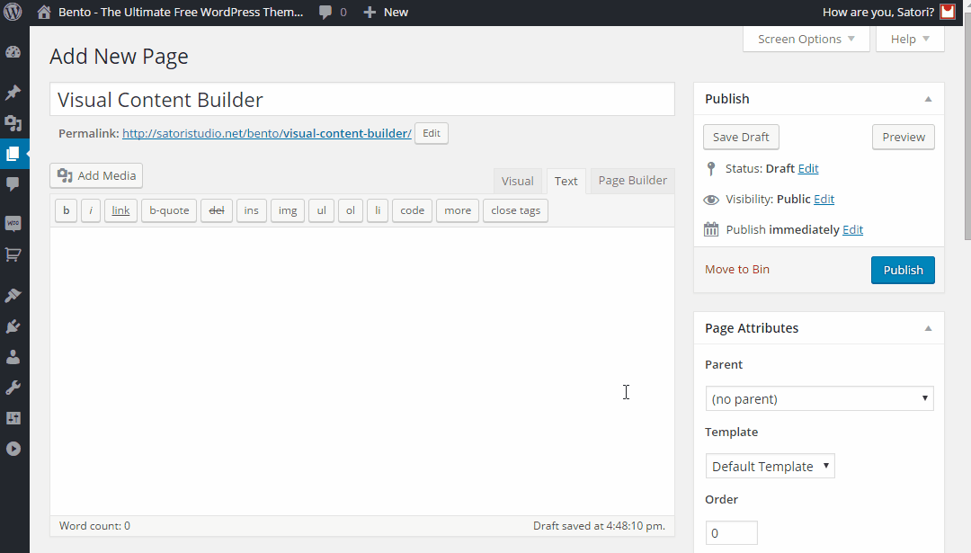Bento comes with a link to install a free powerful content builder which allows creating stunning professional layouts in just minutes, without any coding knowledge. You can divide your content into rows and columns as you wish, as well as choose from dozens of pre-made building blocks - from simple text to image sliders, maps, videos and action buttons, as well as sidebar widgets - to construct the perfect page that suits your specific needs. Try it yourself - get Bento for free here.